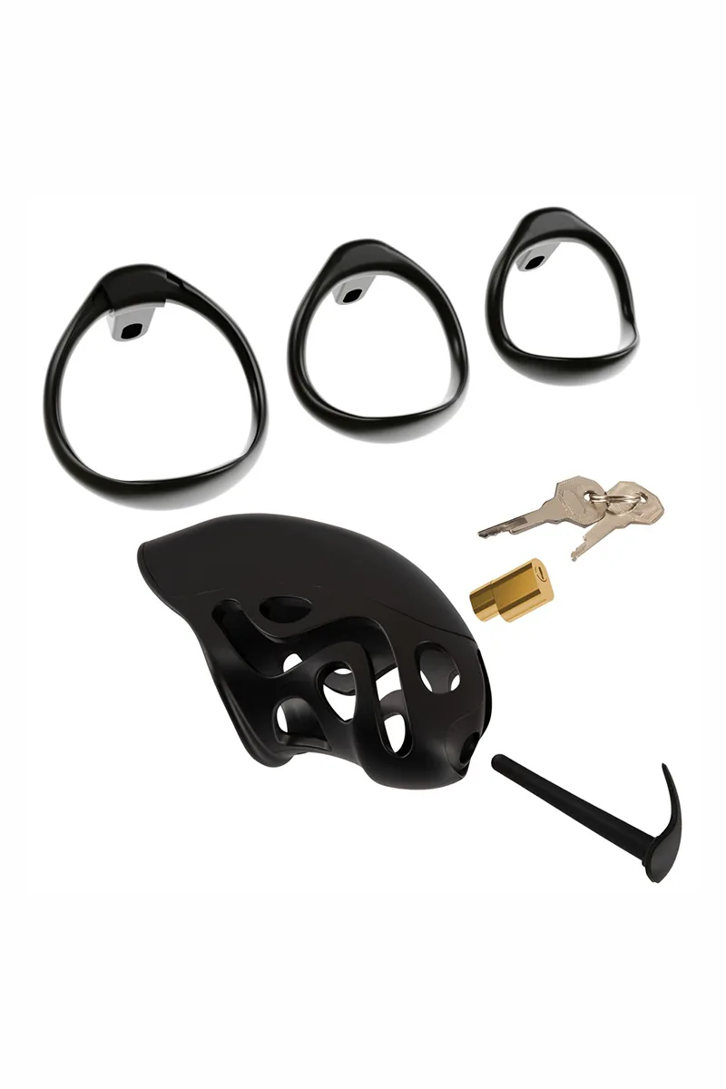 Contenu de la boite : 1 cage à pénis, 3 anneaux testiculaires, 1 dilatateur, 1 serrure, 2 clés