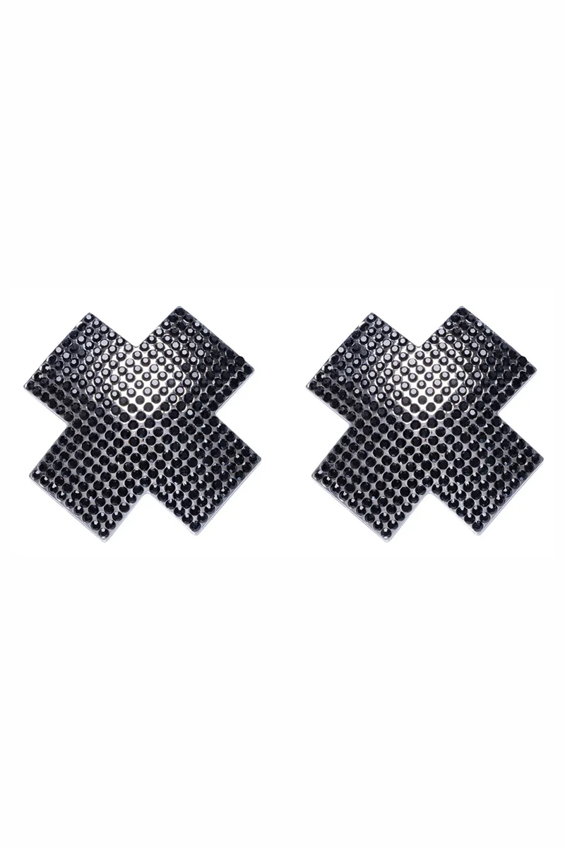 Caches tétons autocollants en forme de croix avec des pierres noires irisés.