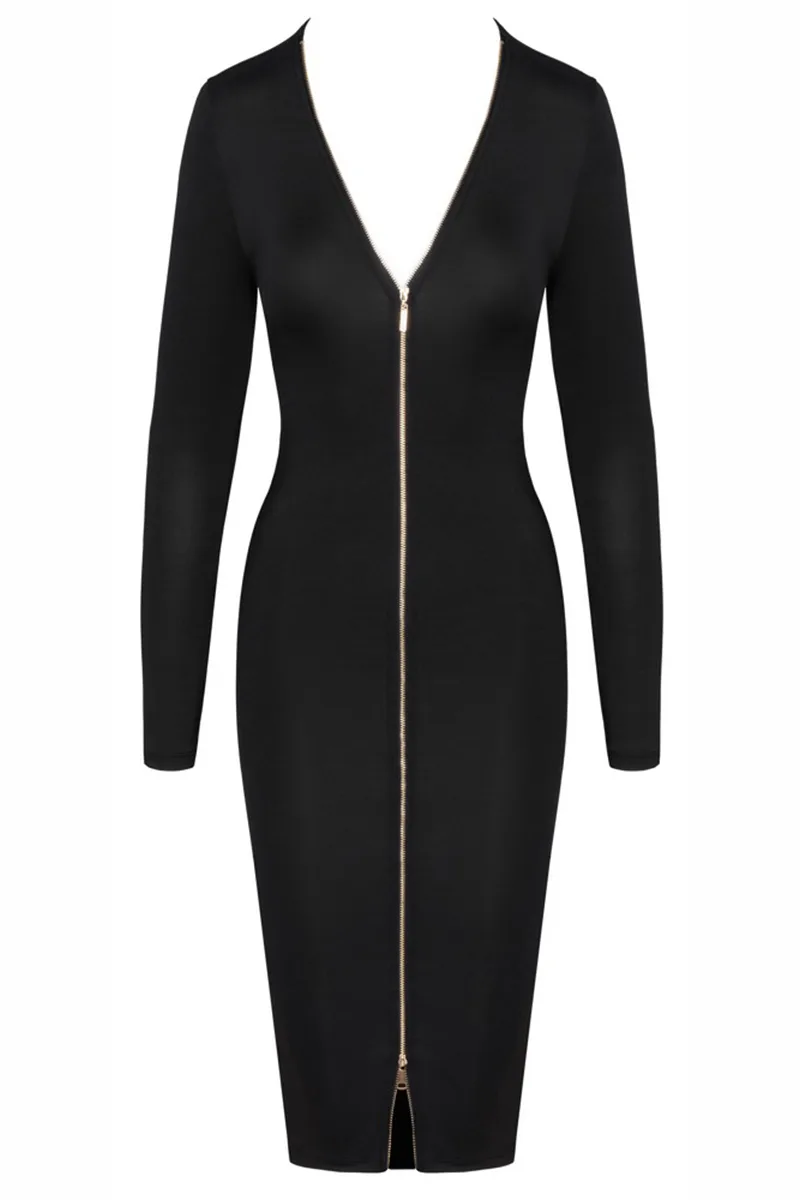 Robe noire cintrée à manches longues avec décolleté et fermeture éclair à double sens.