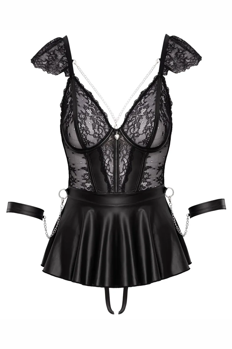 La jupe évasée à l’allure mate est dotée d’anneaux à la taille, prêts à accueillir les menottes douces incluses. Celles-ci, avec leurs chaînes à mousquetons, vous invitent à explorer de nouvelles sensations.