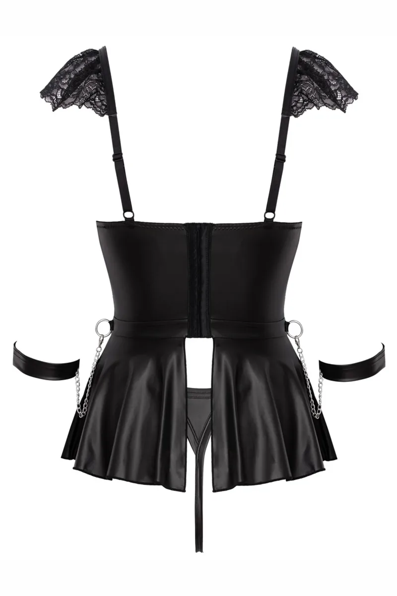 ensemble de lingerie 3 pièces style bondage avec Babydoll, string ouvert et menottes souples.