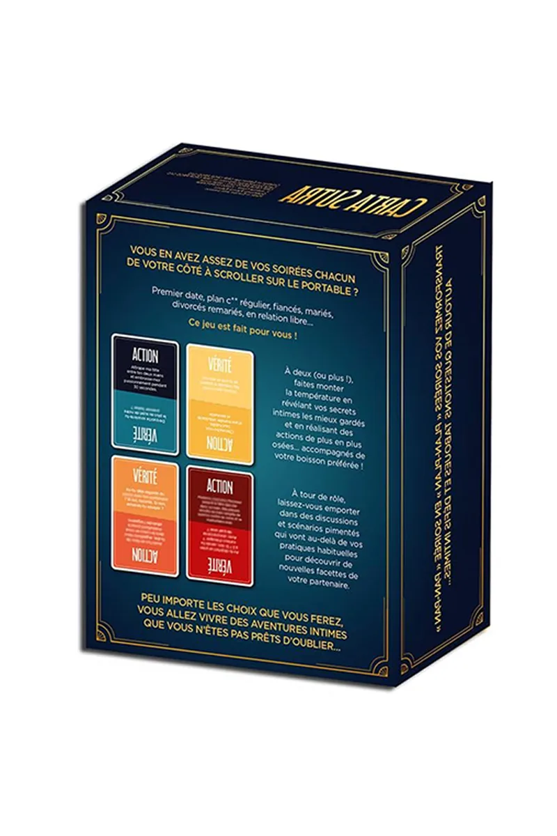 Vous en avez marre de passer vos soirées chacun de votre côté à scroller sur le portable ? Carta Sutra Action ou Vérité est fait pour vous ! Bien plus quun jeu, cest une expérience intense et sensuelle !