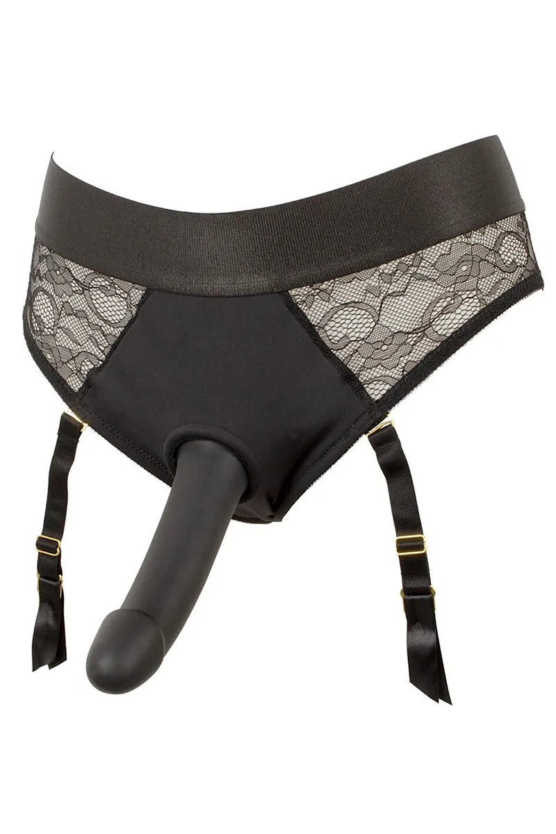 Culotte en dentelle strap-on à jarretelles amovibles + godemiché silicone 17,5 x 3,9 cm.