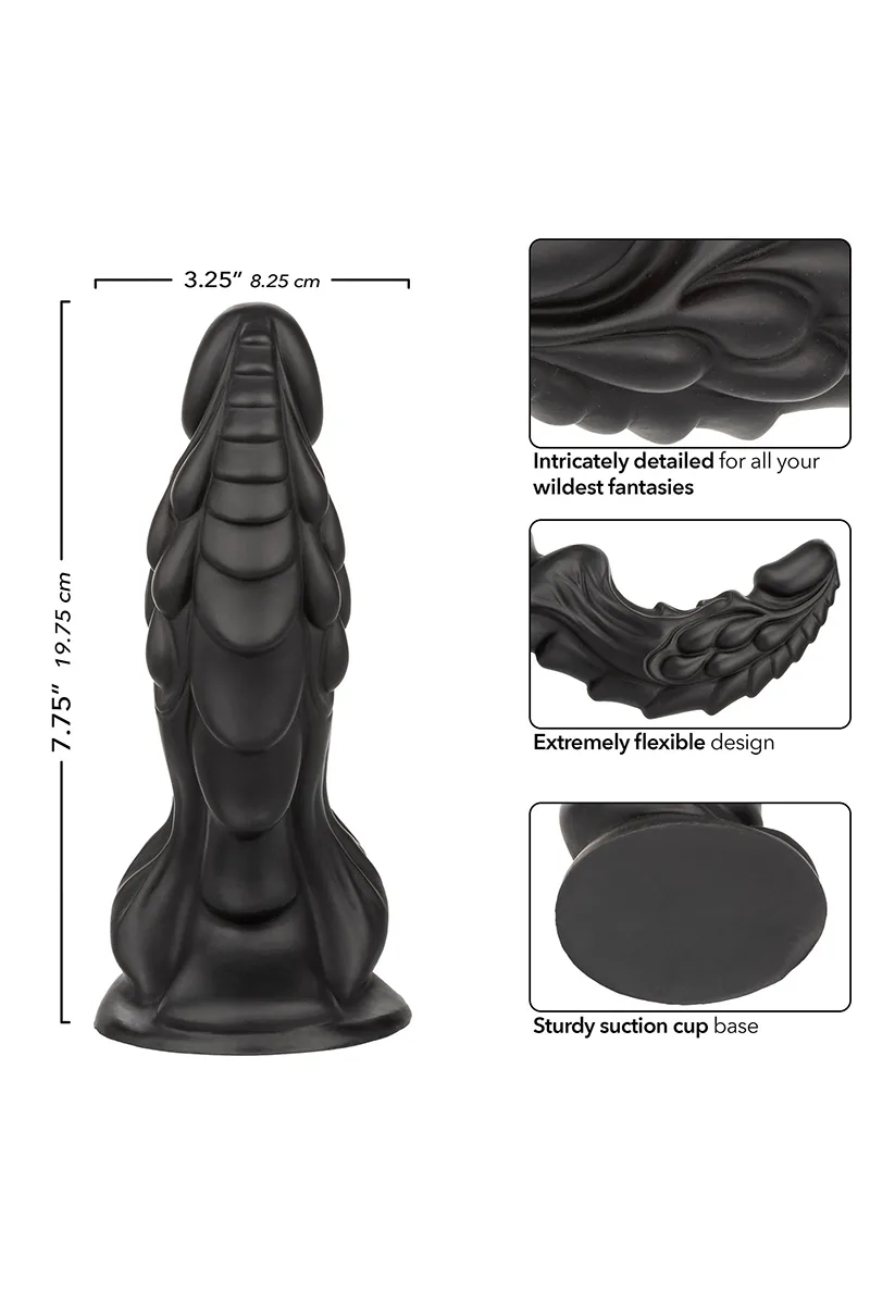 Gode ventouse en silicone liquide avec design de monstre qui suggère l’extrémité d’un alien venu de mars, dimensions 19,75 x 4,6 cm.