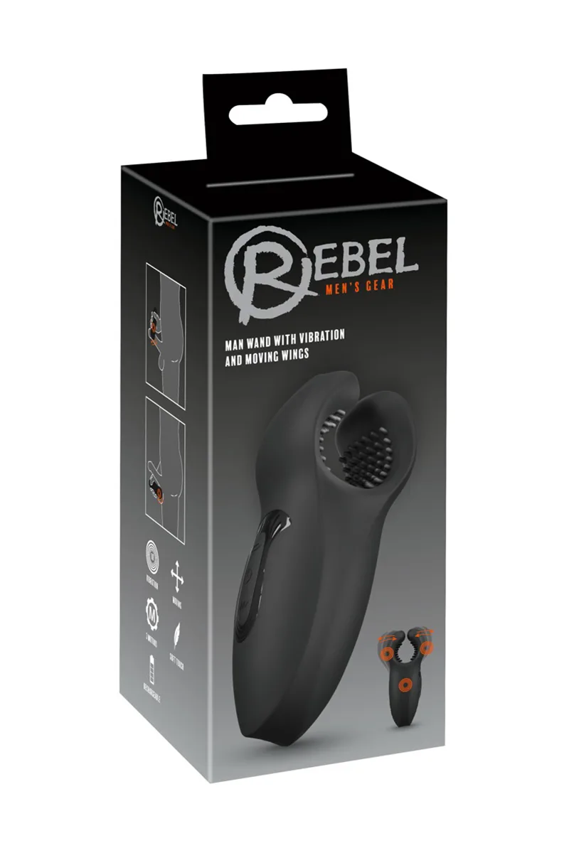 Le « Man Wand with Vibration and Moving Wings » de Rebel prend fermement en main le pénis ou les testicules grâce à ses ailes vibrantes mobiles. La stimulation est décuplée grâce à ses picots doux et ses vibrations intenses.